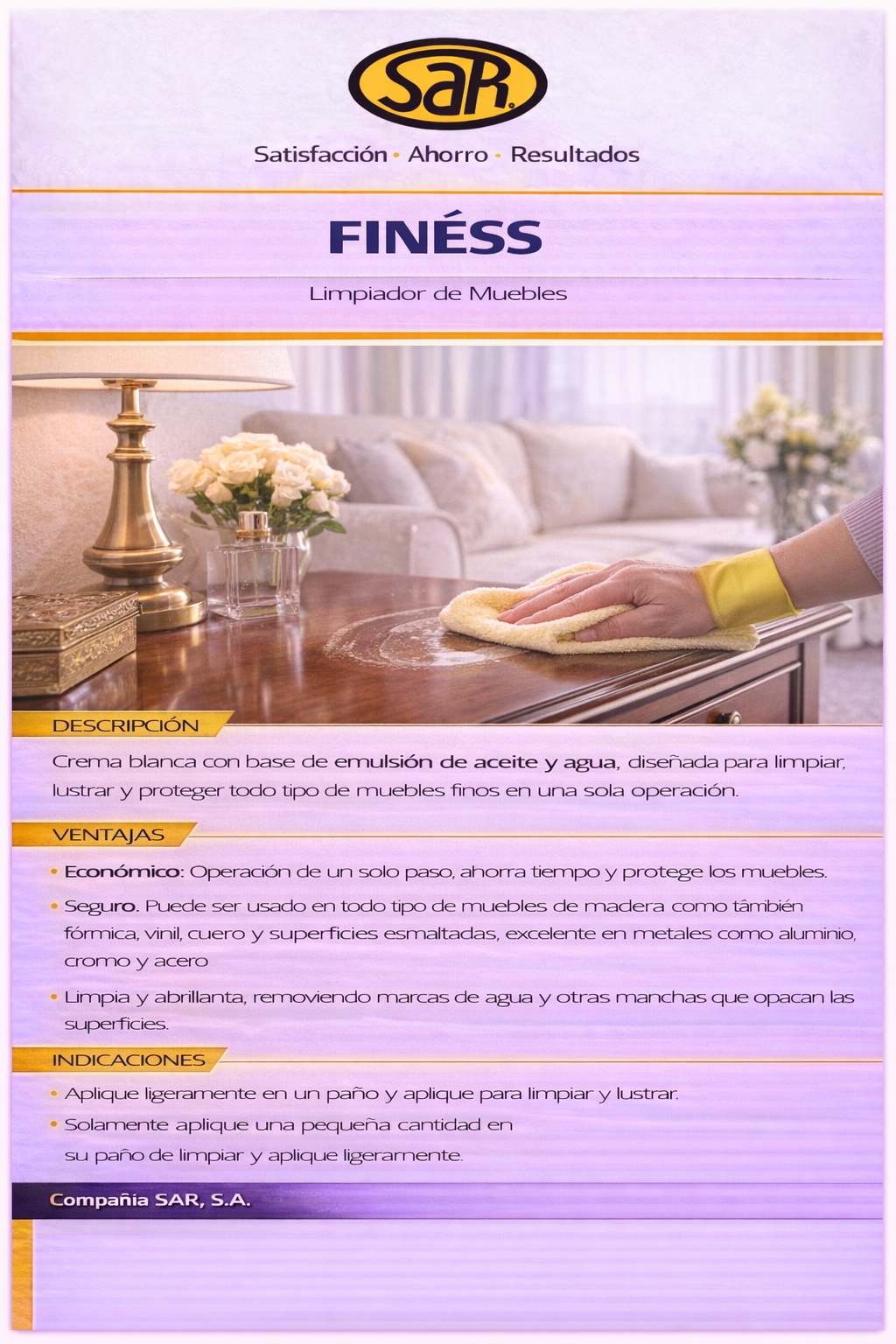 FINESS es una crema limpiadora y abrillantadora premium, legendaria dentro de la línea SAR, creada para limpiar, lustrar y proteger muebles finos en una sola operación.