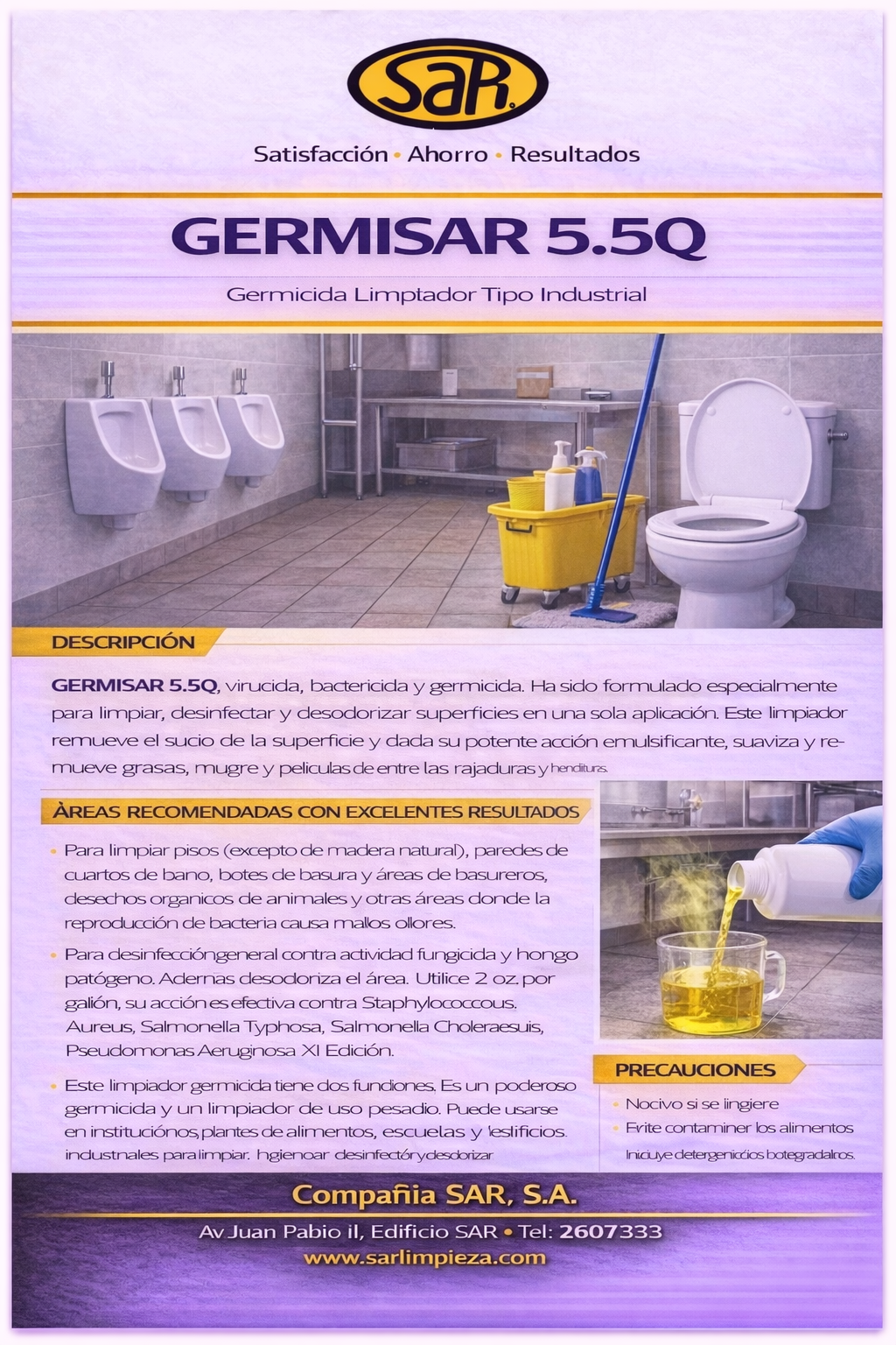 GERMISAR 5.5Q es una mezcla de desinfectantes que mata rápidamente las bacterias y tiene una excelente acción residual / germicida. Estos desinfectantes se han combinado con detergentes biodegradables de excelente acción activa en superficies, humidización rápida y alto poder penetrante.
